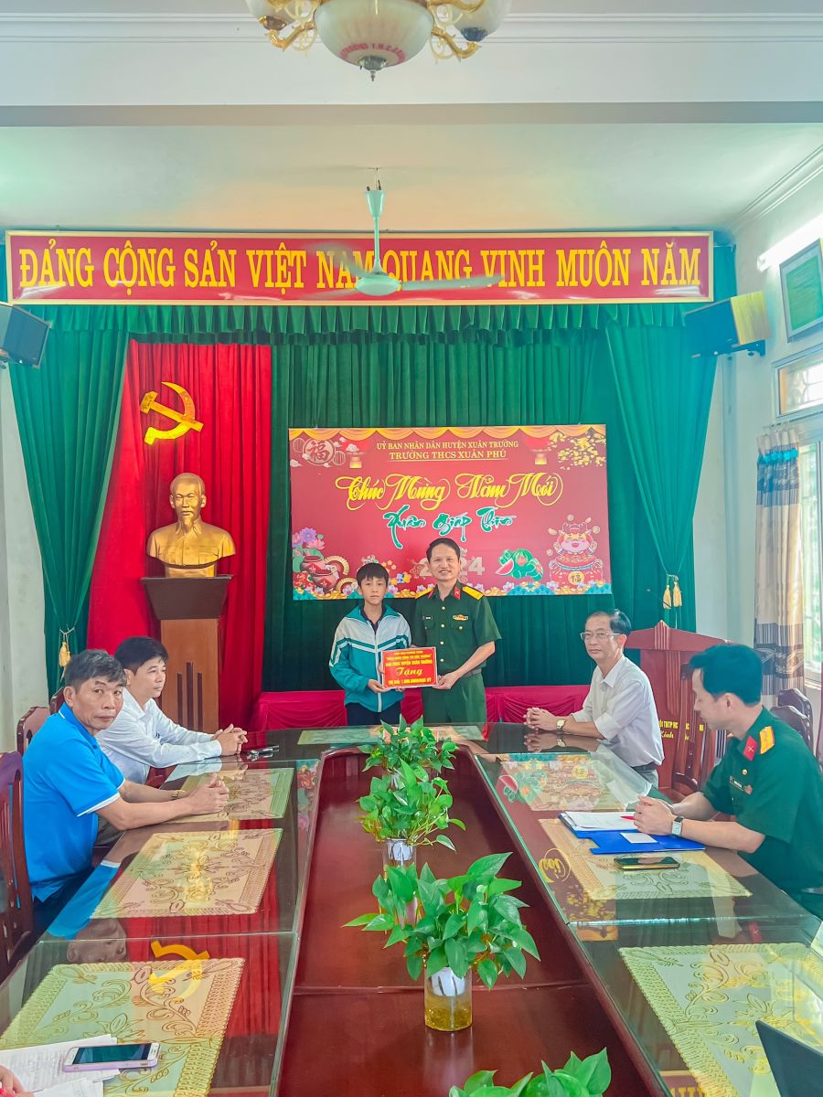Thực hiện chương trình “Đồng hành cùng em đến trường”, ngày 16/04/2024 ban chỉ huy quân sự huyện Xuân Trường đã trao học bổng cho em Đặng Văn Hưng, học sinh lớp 9D trường THCS Xuân Phú. Chương trình “Đồng hành cùng em đến trường” được Ban chỉ huy quân sự huyện Xuân Trường tổ chức hàng năm. Có 3 học sinh trên địa bàn huyện Xuân Trường được Ban chỉ huy quân sự huyện trao quà hàng năm, mỗi học kỳ một lần với số tiền một triệu đồng/học kỳ. Phần quà của Ban chỉ huy quân sự huyện là nguồn động lực to lớn động viên các em cố gắng vươn lên trong học học tập. Xin trân trọng ghi nhận và cảm ơn tấm lòng của các cán bộ chiến sĩ của Ban chỉ huy quân sự huyện đã dành cho các em học sinh có hoàn cảnh khó khăn trên địa bàn huyện. Kính chúc các đồng chí luôn mạnh khỏe, công tác tốt và luôn đồng hành cúng các em đến trường.